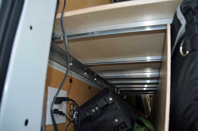 To remedy the sleeping problem, I used rivet nuts and lengths of 1.5 inch aluminum right angle bolted to those rivet nuts along each side of the van, to support half inch birch ply, itself braced with aluminum C-channel, to create a bed platform above the slide out tray…