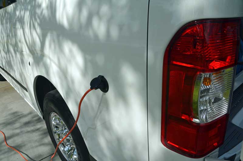 The issue of the 120 VAC connection was easy to solve. We got San Diego Trailer Supply to install an external socket….