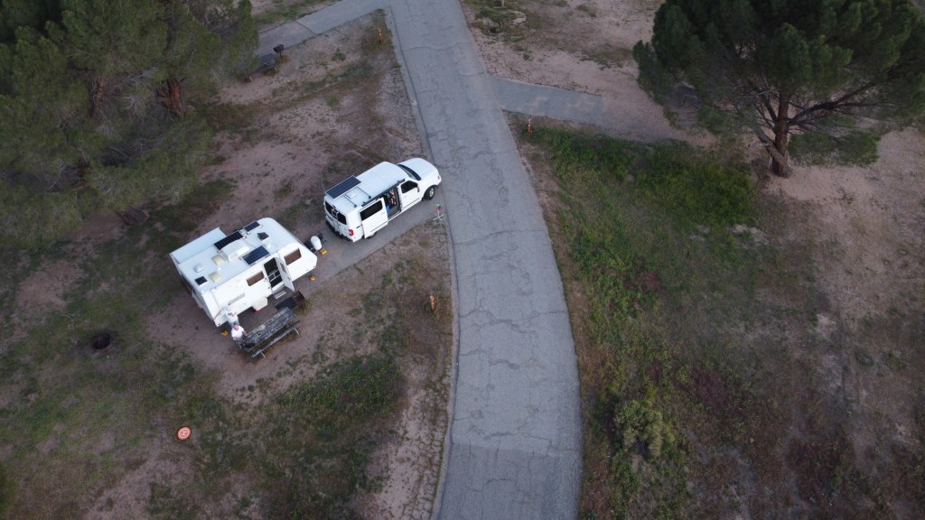 We also now have a drone, so here’s a photo of us camping, taken by the drone: